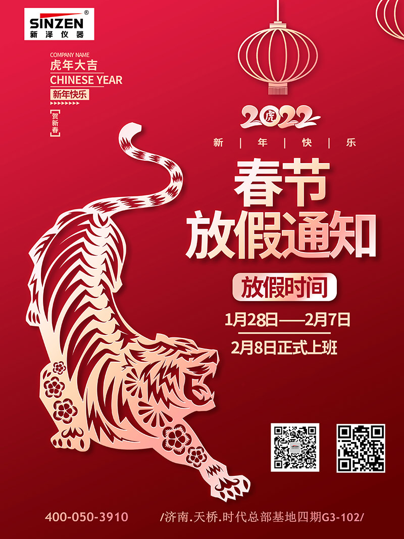 我公司將在2022年1月28日至2月7日放假,2月8號(hào)正式上班,在此期間如有問題可咨詢:400-050-3910 非常感謝大家的支持與鼓勵(lì)!山東新澤儀器有限公司全體員工祝您春節(jié)假期愉快!萬事如意!