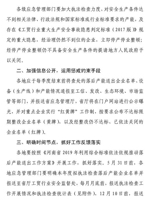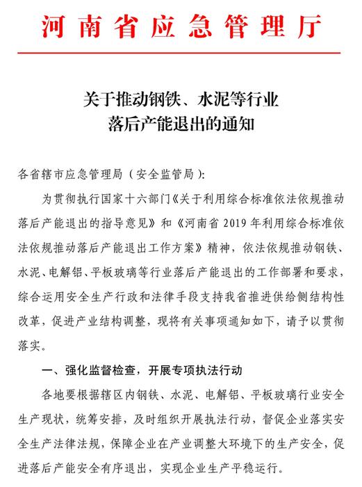 4月25日,河南省應(yīng)急管理廳下發(fā)《關(guān)于推動鋼鐵、水泥等行業(yè)落后產(chǎn)能退出的通知》?!锻ㄖ访鞔_表示將利用安全生產(chǎn)行政和法律手段推進(jìn)水泥、鋼鐵等行業(yè)落后產(chǎn)能退出?!锻ㄖ芬蟾骷墤?yīng)急管理部門要加大執(zhí)法檢查力度,對安全生產(chǎn)條件達(dá)不到相關(guān)法律、行政法規(guī)和國家標(biāo)準(zhǔn)或行業(yè)標(biāo)準(zhǔn)要求的產(chǎn)能,及存在《工貿(mào)行業(yè)重大生產(chǎn)安全事故隱患判定標(biāo)準(zhǔn)(2017版)》規(guī)定的重大隱患,經(jīng)治理仍然不到位的企業(yè),立即停業(yè)停產(chǎn)整頓;經(jīng)停業(yè)停產(chǎn)整頓仍不具備安全生產(chǎn)條件的提請地方人民政府予以關(guān)閉。