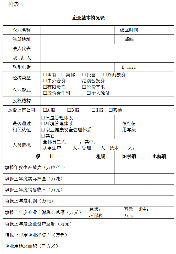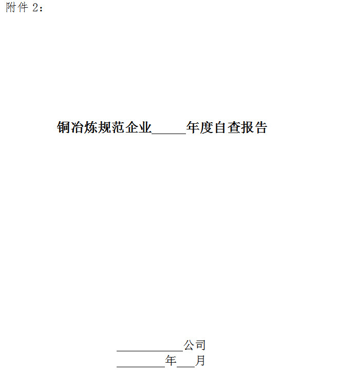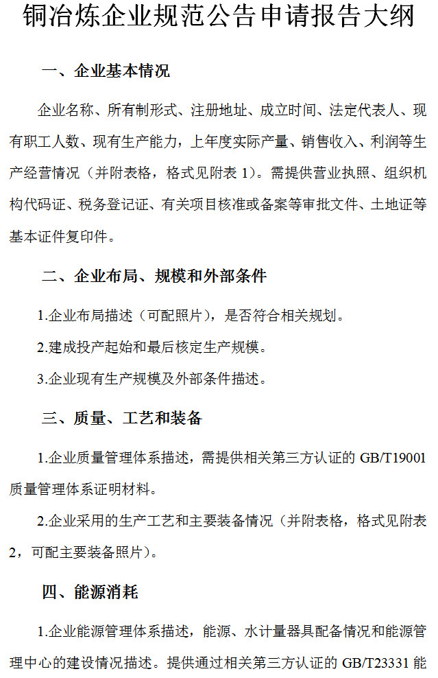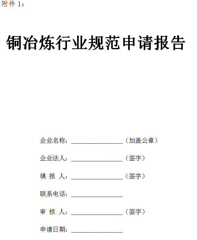 2.凡已建成投產(chǎn)1年以上(含1年)的銅冶煉企業(yè),均可依據(jù)《銅冶煉行業(yè)規(guī)范條件》申請審核。申請規(guī)范企業(yè)須編制《銅冶煉行業(yè)規(guī)范申請報告》(見附件1),并按要求提供相關(guān)材料,企業(yè)法人(或代表)、填報人和審核人須對申請材料的完整真實性負責(zé)并承擔(dān)相應(yīng)責(zé)任。