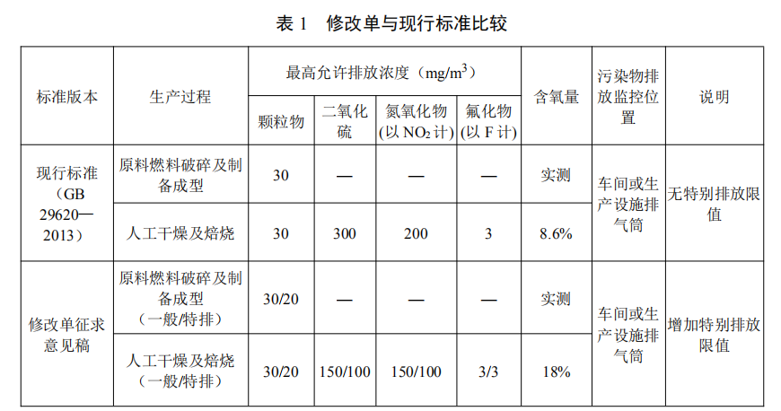 目前磚瓦行業(yè)執(zhí)行GB 29620—2013,梳理標(biāo)準(zhǔn)存在的問題,對磚瓦窯煙氣 基準(zhǔn)含氧量、重點地區(qū)特別排放限值等方面進行了修改,修改前后標(biāo)準(zhǔn)變化情 況見表1。