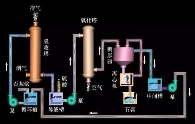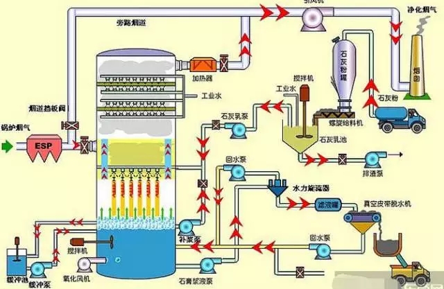 石灰石(石灰)石膏脫硫系統包括煙氣換熱系統、吸收塔脫硫系統、脫硫漿液制備系統、亞硫酸鈣氧化系統、石膏脫水系統等幾部分;該工藝是目前世界上最成熟應用最廣泛的技術。