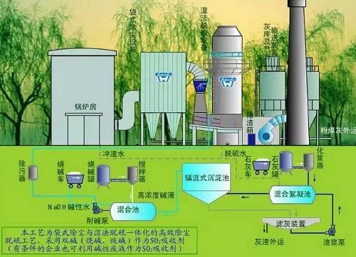 由于在吸收和吸收液處理中,使用了兩種不同類型的堿,故稱為雙堿法。雙堿法包括了鈉鈣、鎂鈣、鈣鈣等各種不同的雙堿工藝。鈉鈣雙堿法是較為常用的脫硫方法之一,成功應用于電站和工業鍋爐。