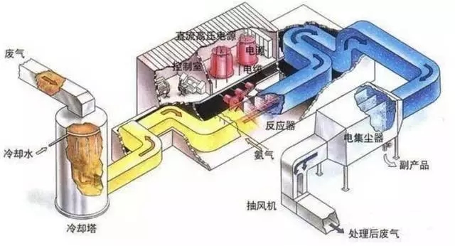用高能電子束照射煙氣,生成大量的活性物質,將煙氣中的SO2和氮氧化物氧化為SO3和二氧化氮(NO2),進一步生成H2SO4和硝酸(NaNO3),并被氨(NH3)或石灰石(CaCO3)吸收劑吸收