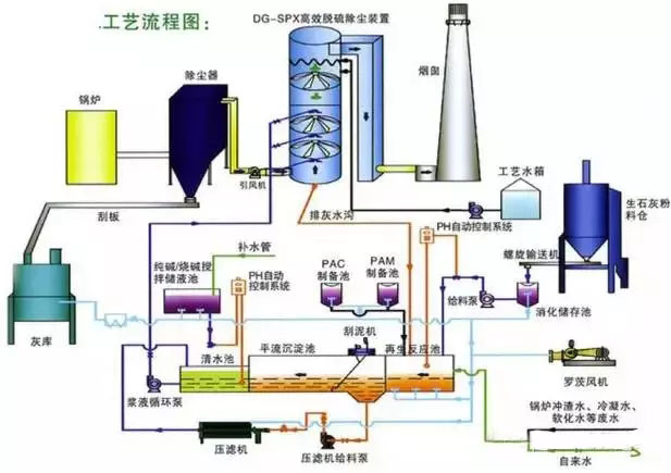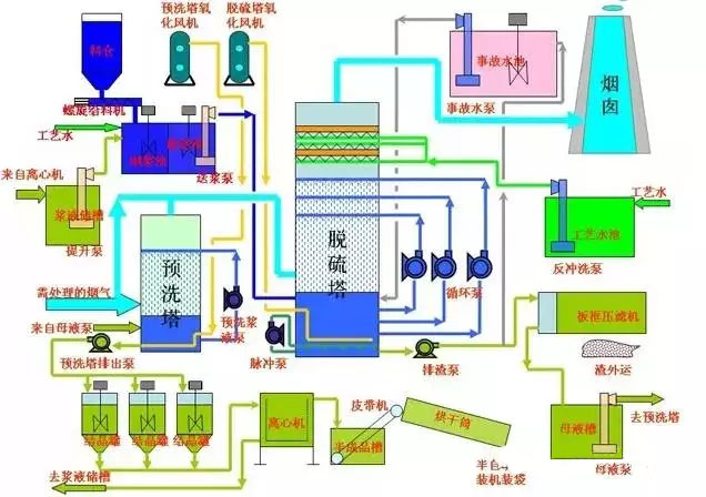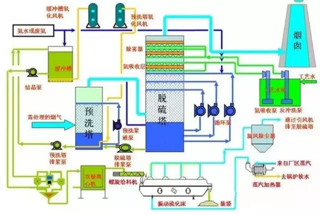 該工藝主要由脫硫洗滌系統、濃縮系統、煙氣系統、氨貯存系統、硫酸銨生產系統(若非氨-硫銨法則是于其工藝相對應的副產物制造系統)、電氣自動控制系統等組成。