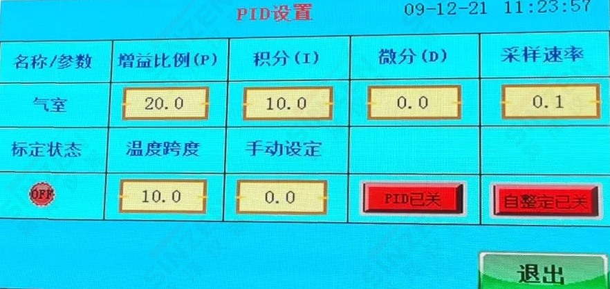溫度PID自整定畫面應該是PID已關按鍵變成綠色按健,PID已開為正常狀態。當溫度到達180度設置值后,需要手動點擊一下自整定已關按鍵,變成綠色,自整定已開,經過一分鐘后自動恢復紅色狀態。